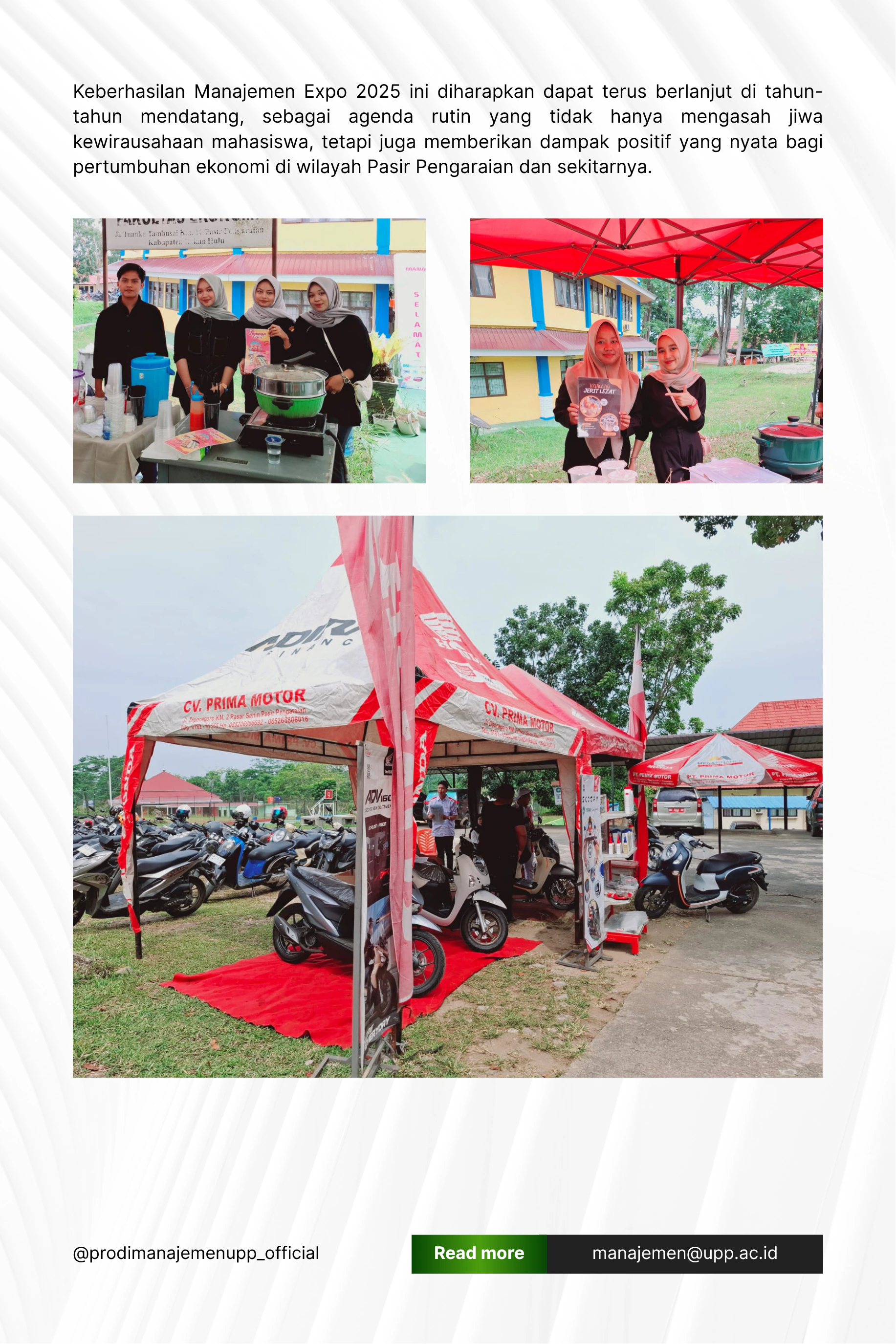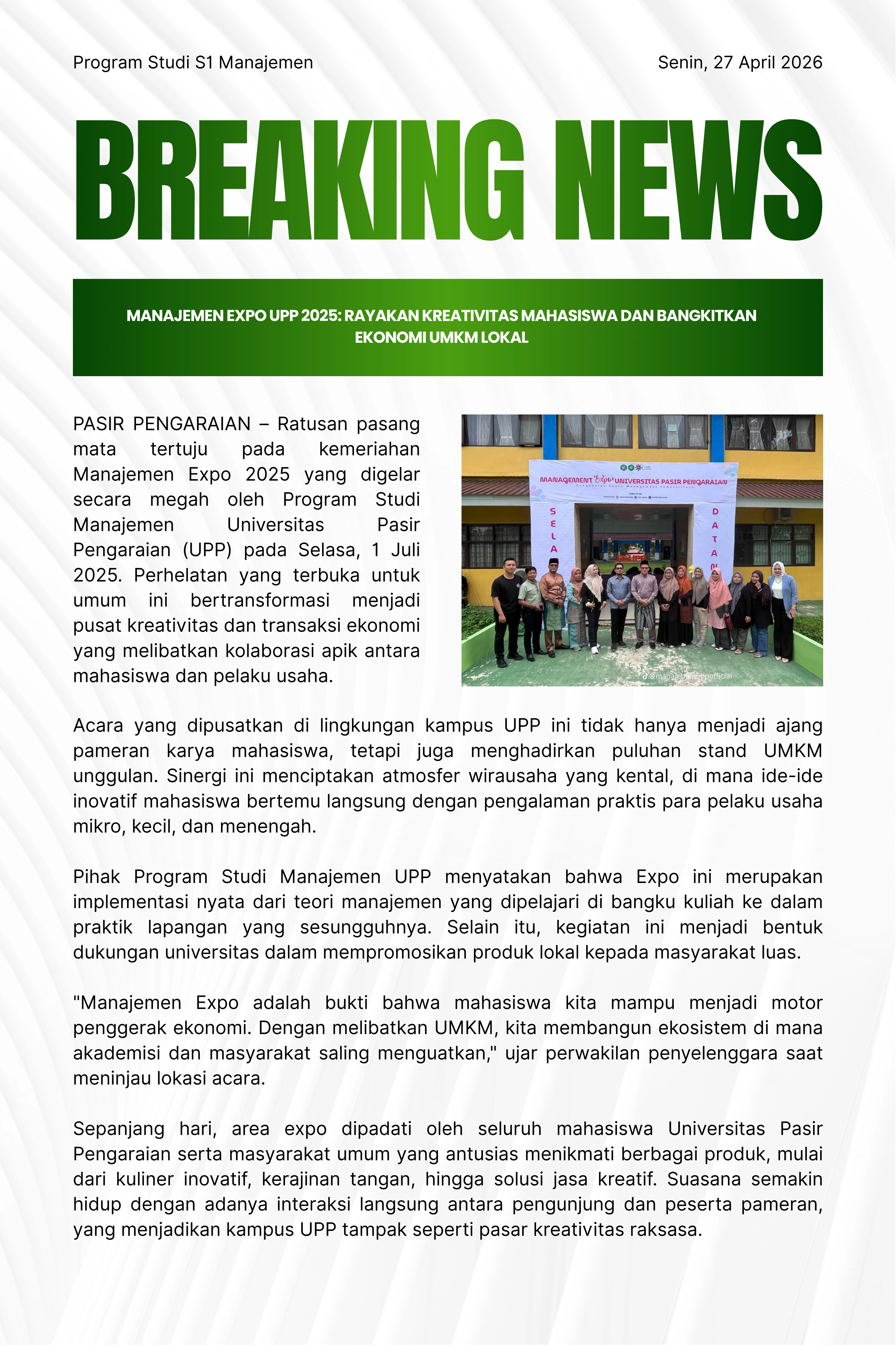 PASIR PENGARAIAN – Ratusan pasang mata tertuju pada kemeriahan Manajemen Expo 2025 yang digelar secara megah oleh Program Studi Manajemen Universitas Pasir Pengaraian (UPP) pada Selasa, 1 Juli 2025. Perhelatan yang terbuka untuk umum ini bertransformasi menjadi pusat kreativitas dan transaksi ekonomi yang melibatkan kolaborasi apik antara mahasiswa dan pelaku usaha.