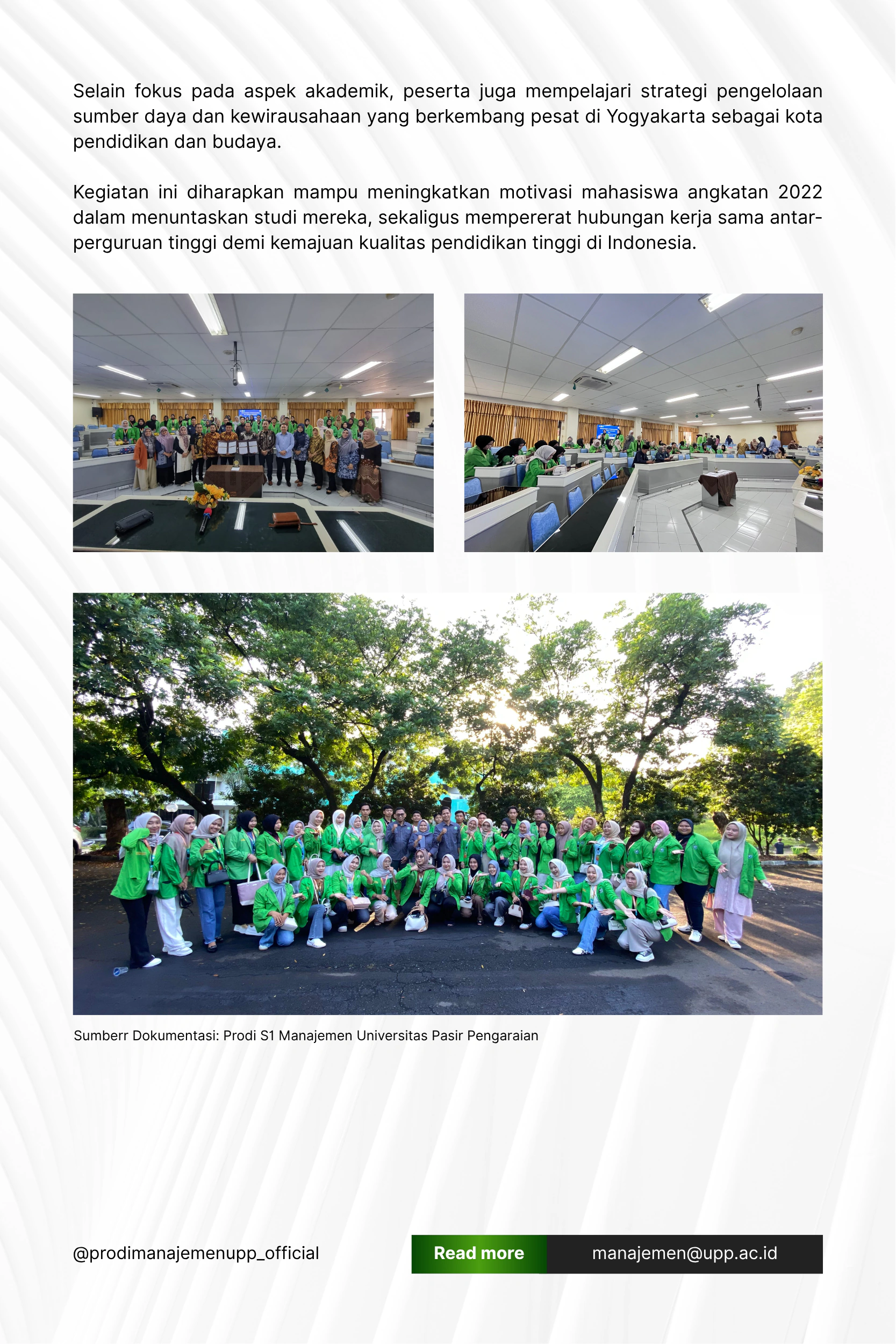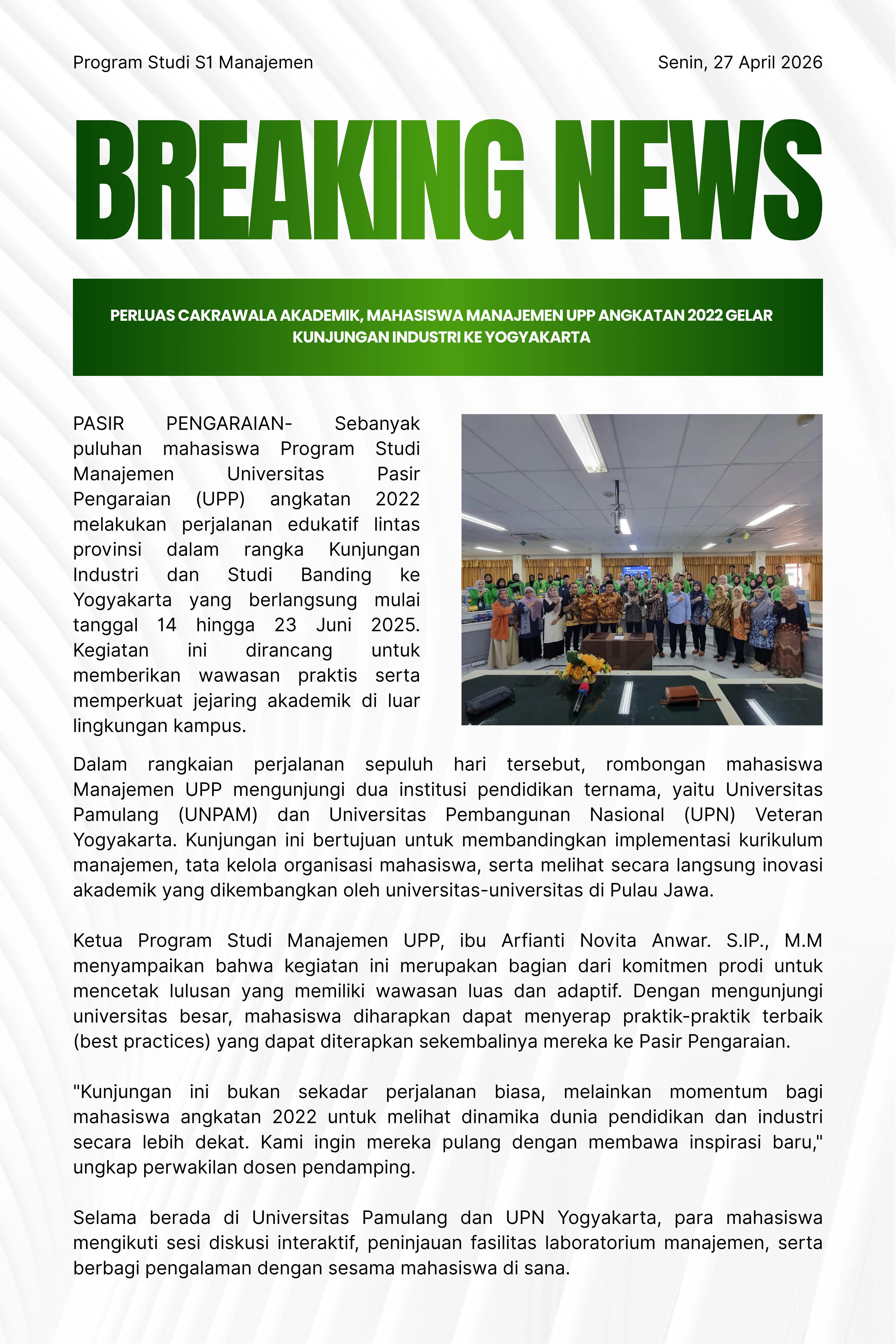 PASIR PENGARAIAN - Sebanyak puluhan mahasiswa Program Studi Manajemen Universitas Pasir Pengaraian (UPP) angkatan 2022 melakukan perjalanan edukatif lintas provinsi dalam rangka Kunjungan Industri dan Studi Banding ke Yogyakarta yang berlangsung mulai tanggal 14 hingga 23 Juni 2025. Kegiatan ini dirancang untuk memberikan wawasan praktis serta memperkuat jejaring akademik di luar lingkungan kampus.