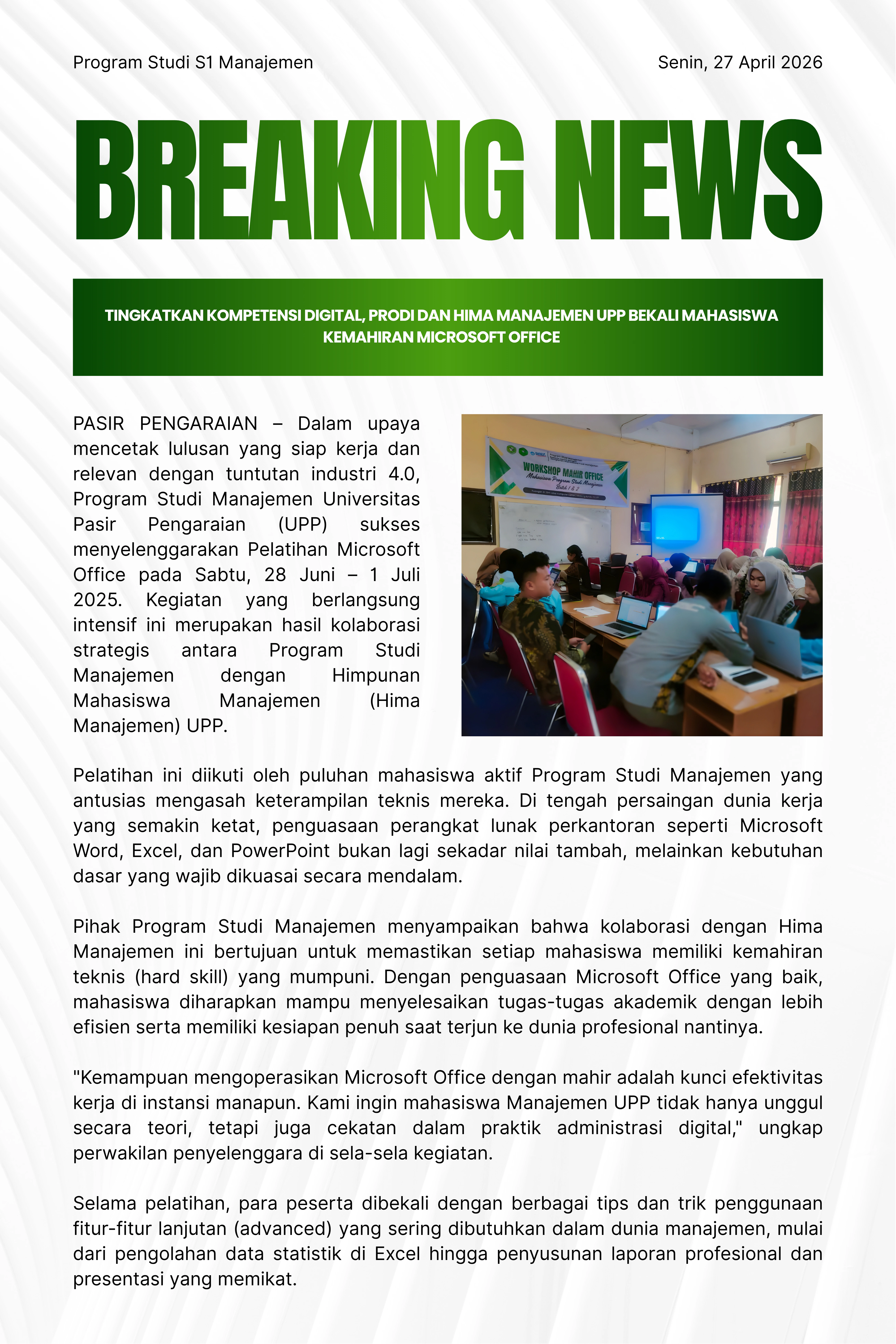 PASIR PENGARAIAN – Dalam upaya mencetak lulusan yang siap kerja dan relevan dengan tuntutan industri 4.0, Program Studi Manajemen Universitas Pasir Pengaraian (UPP) sukses menyelenggarakan Pelatihan Microsoft Office pada Sabtu, 28 Juni – 1 Juli 2025. Kegiatan yang berlangsung intensif ini merupakan hasil kolaborasi strategis antara Program Studi Manajemen dengan Himpunan Mahasiswa Manajemen (Hima Manajemen) UPP.